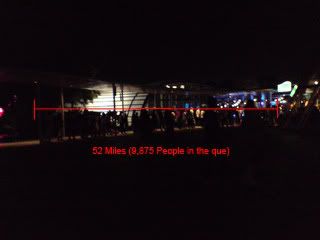 The que length up to 52 miles containing 9,875 people in the que. Gosh... I'm glad we made it in earlier...
